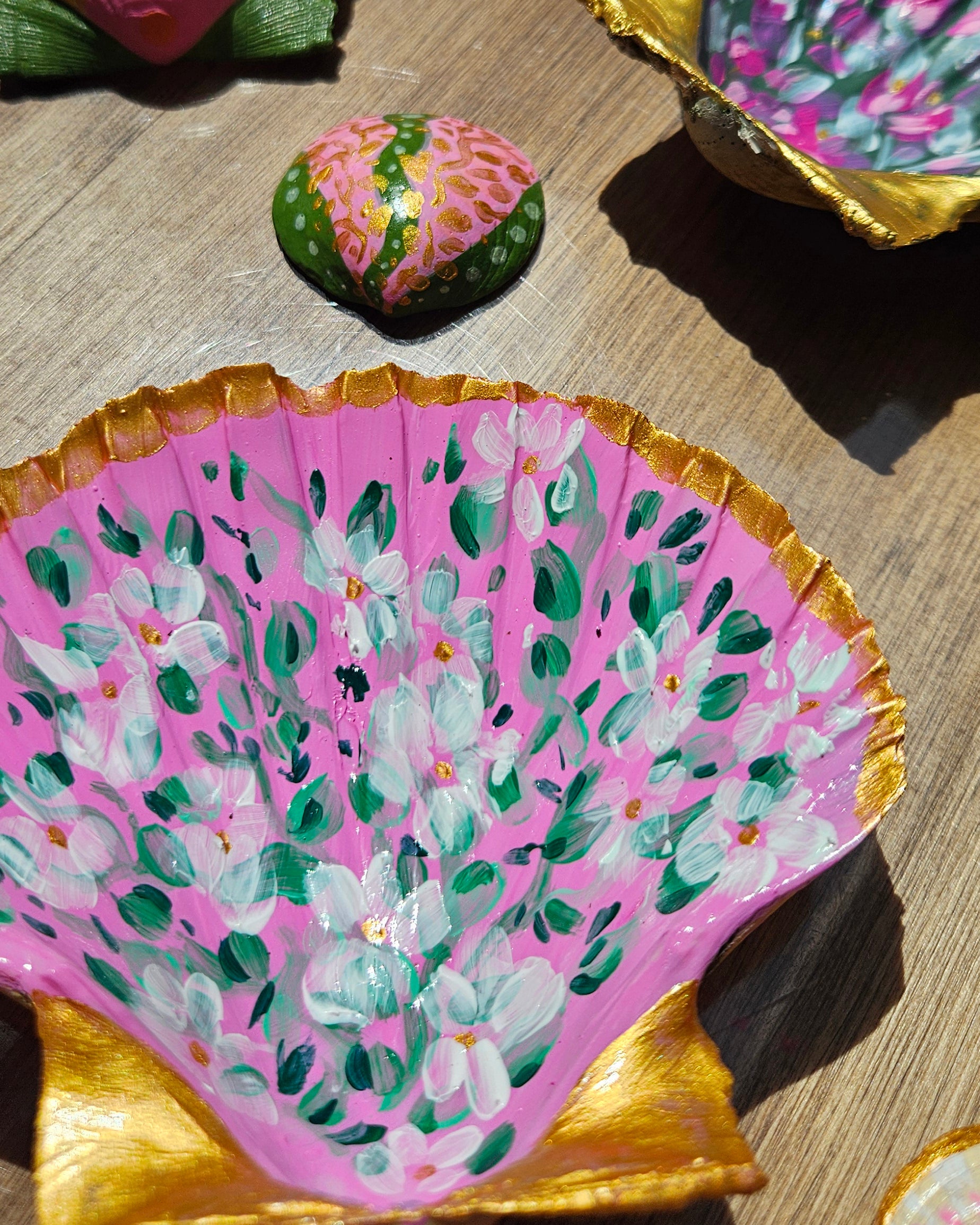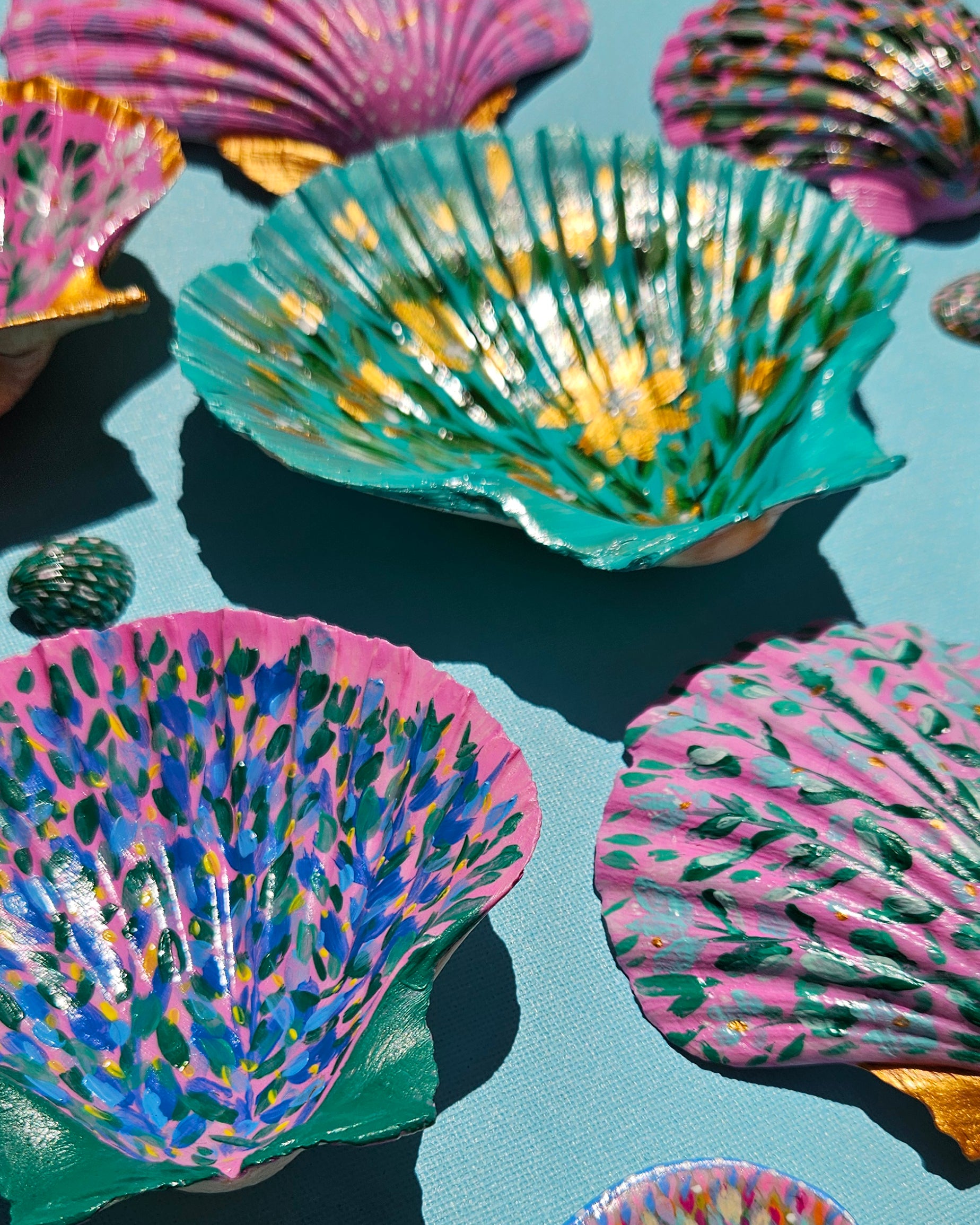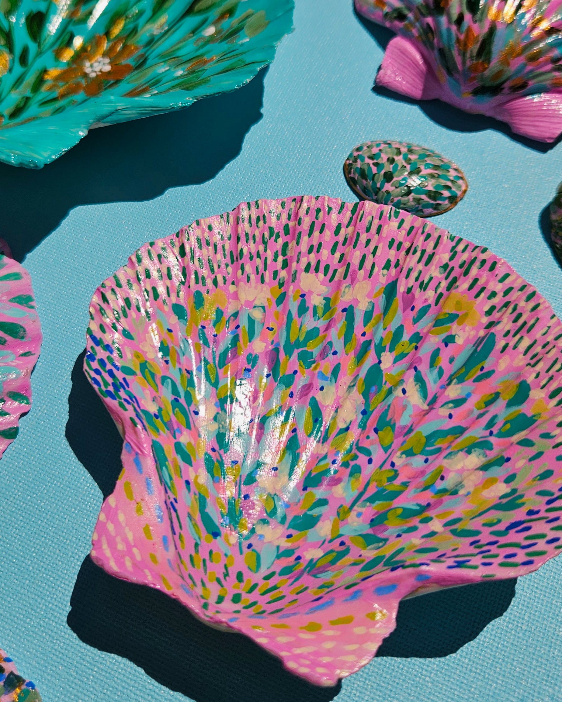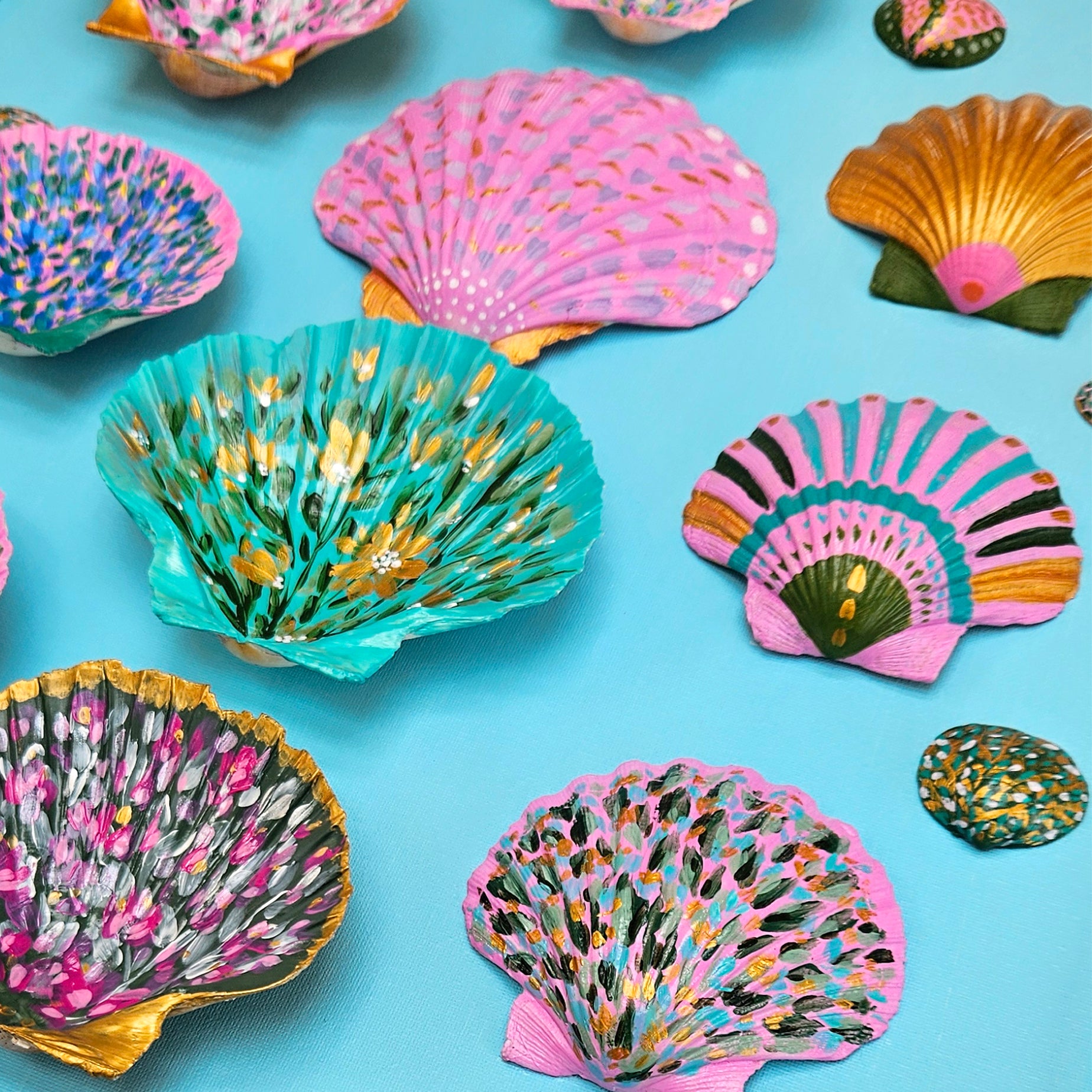 One of a kind, hand painted Cornish shells on a hand painted canvas board. Framed in a white wooden frame. The shells have been framed without glass so that the full 3D effect comes across when hung on the wall.
